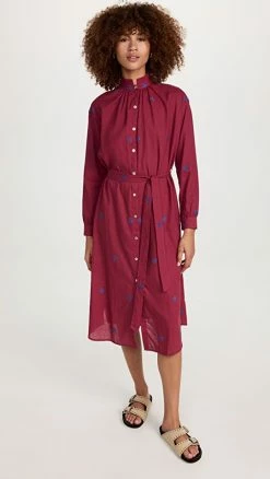 - Self-belt at waist and button placket