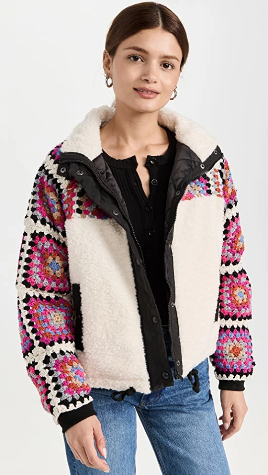A distinct and truly charming cold-weather layer, this BLANKNYC jacket is crafted from a mix of fuzzy sherpa and colorfully patterned crochet. Inset drawstrings at the hem provide an adjustable fit.