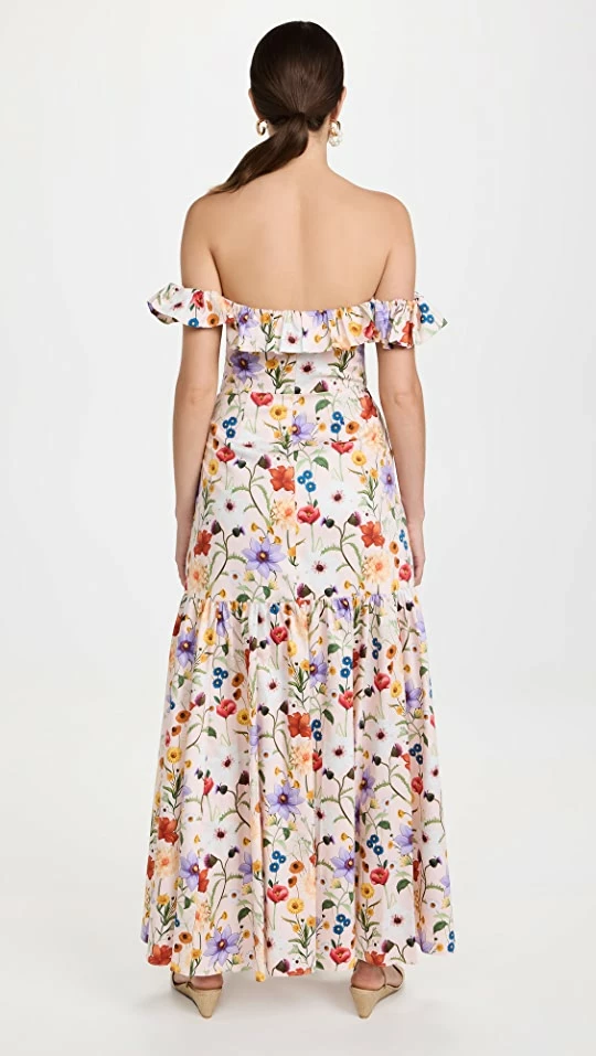 - Off-shoulder neckline with elastic shoulder straps and ruffle trim