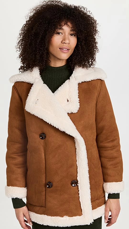 New favorite layer alert! Stay cozy and look timeless in this En Saison Quincy coat, which features a classic double-breasted silhouette and a contrast mix of soft sherpa and faux suede.