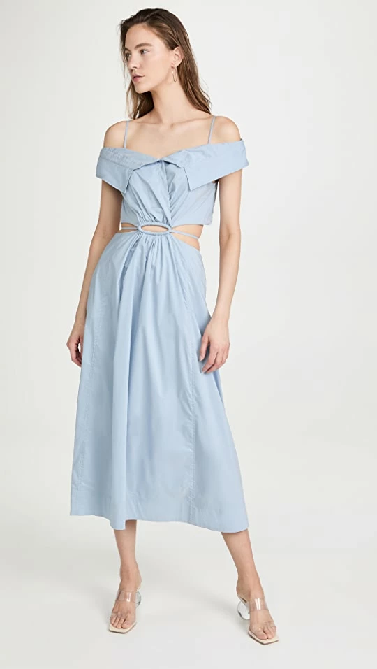 Cutouts at the waist and an overlay at the neckline distinguish this occasion-worthy Jonathan Simkhai dress, which is crafted from crisp, light-blue poplin.