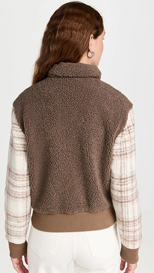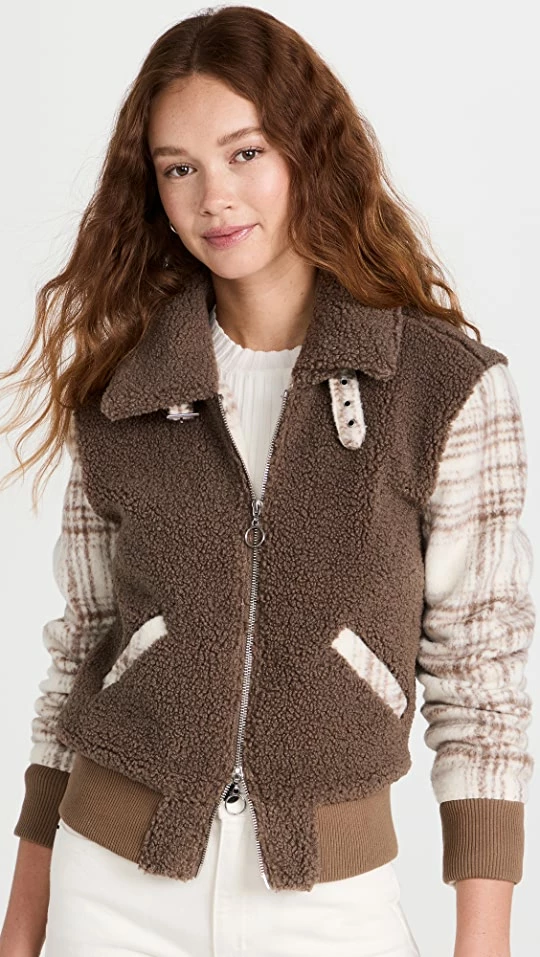 Cheap ???? Jonathan Simkhai STANDARD Brushed Wool Plaid Sherpa Bomber Jacket Taupe Plaid ????
