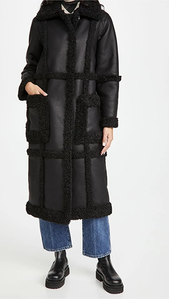 A bold option for your winter wardrobe, this warm STAND STUDIO coat is crafted in faux leather and accented with a windowpane motif in plush sherpa throughout the silhouette.