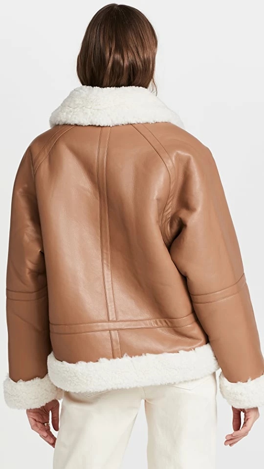A substantial STAND STUDIO jacket that’s guaranteed to keep you warm as the weather turns, cut with an oversized silhouette and crafted from a mix of caramel-colored faux leather and contrast sherpa.