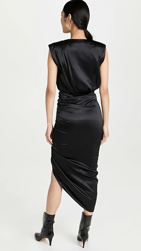 Silky stretch-satin, lightly padded shoulders and ruching elevate the sophisticated silhouette of this Veronica Beard dress, while an asymmetric hem and surplice neckline add romance. Wear it with delicate jewelry and strappy heels.